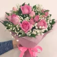 ДЕЛЮКС: роза розовая - 15 шт., роза кустовая розовая - 10 шт., гипсофила - 6 шт., рускус, фетр розовый, бант розовый. Примерный диаметр букета 50х50 см.