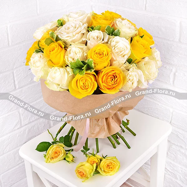 35 роз (на фото): роза жёлтая - 18 шт., роза белая - 17 шт., питтоспорум, упаковка, лента.