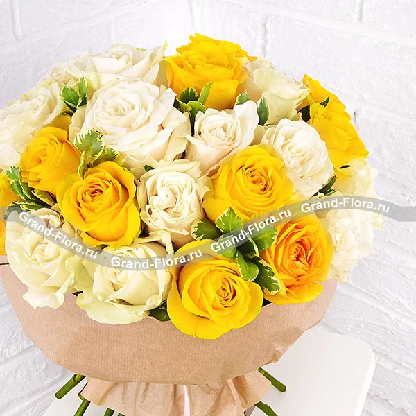 51 роз: роза жёлтая - 26 шт., роза белая - 25 шт., питтоспорум, упаковка, лента.