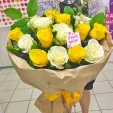 25 роз: роза жёлтая - 13 шт., роза белая - 12 шт., питтоспорум, упаковка, лента.