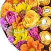 Стандартный: тюльпан фиолетовый - 3 шт., хризантема кустовая желтая - 1 шт., хризантема кустовая фиолетовая - 1 шт., хризантема кустовая оранжевая - 1 шт., статица, конфеты "Fererro Rocher" - 125гр., оазис, коробка.
